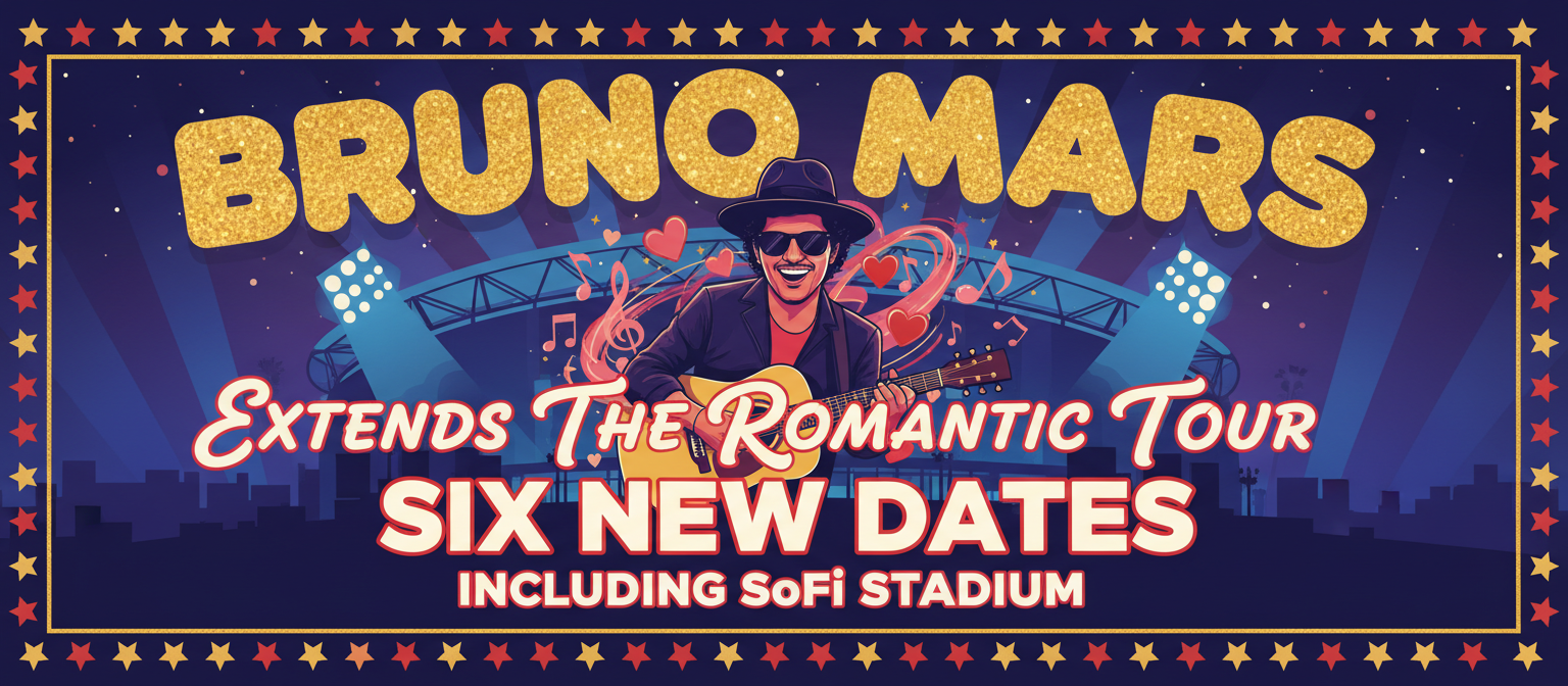Bruno Mars has expanded his 2026 The Romantic Tour with six new dates, adding two extra nights at SoFi Stadium in Inglewood and a four-show Mexico City run.