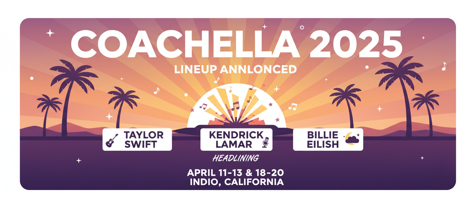 Coachella 2025 lineup announced with Taylor Swift, Kendrick Lamar, and Billie Eilish headlining. Festival runs April 11-13 and 18-20 in Indio, California.