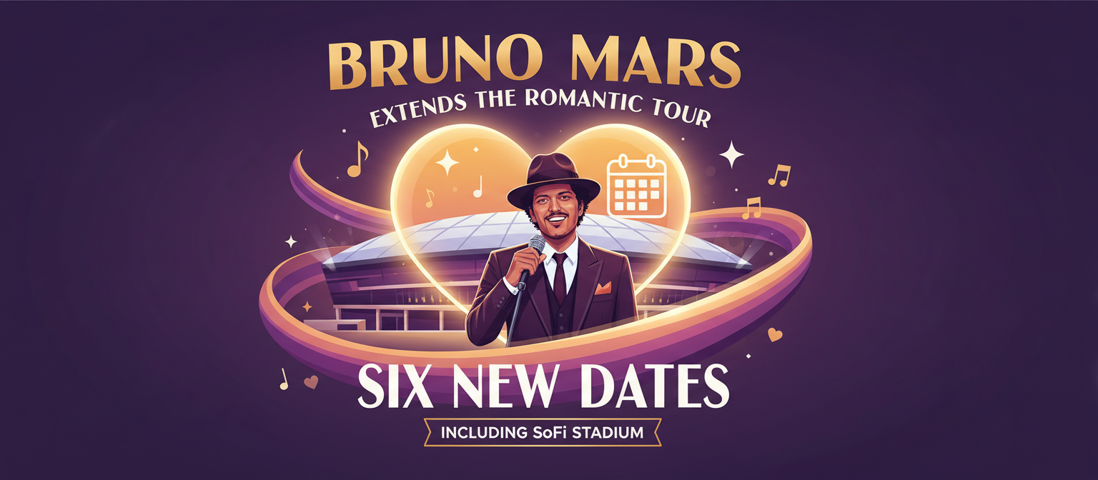 Bruno Mars has added six dates to his 2026 “The Romantic Tour,” including a four-night run in Mexico City and additional stadium shows in Inglewood and Vancouver. The expansion keeps the pop-R&B star on the road through October, with two extra nights now confirmed at SoFi Stadium in Inglewood on October 2 and October 3, and a third SoCal performance on October 6.