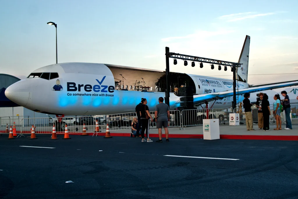 As the sun began to set, the crowd slowly assembled across the grounds of the newly renovated San Bernardino International Airport. What normally feels like an industrial space shifted into something more relaxed. The aroma of Pink’s Hot Dogs mixed with the sounds of a beer garden, kids running around, and groups settling in while everyone waited to see what would happen once the lights came up on the plane.